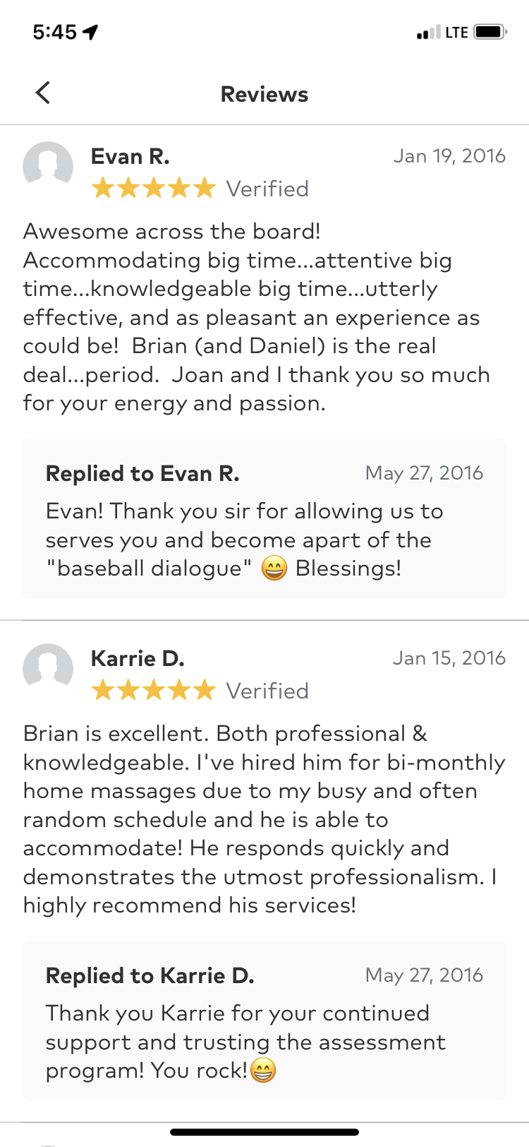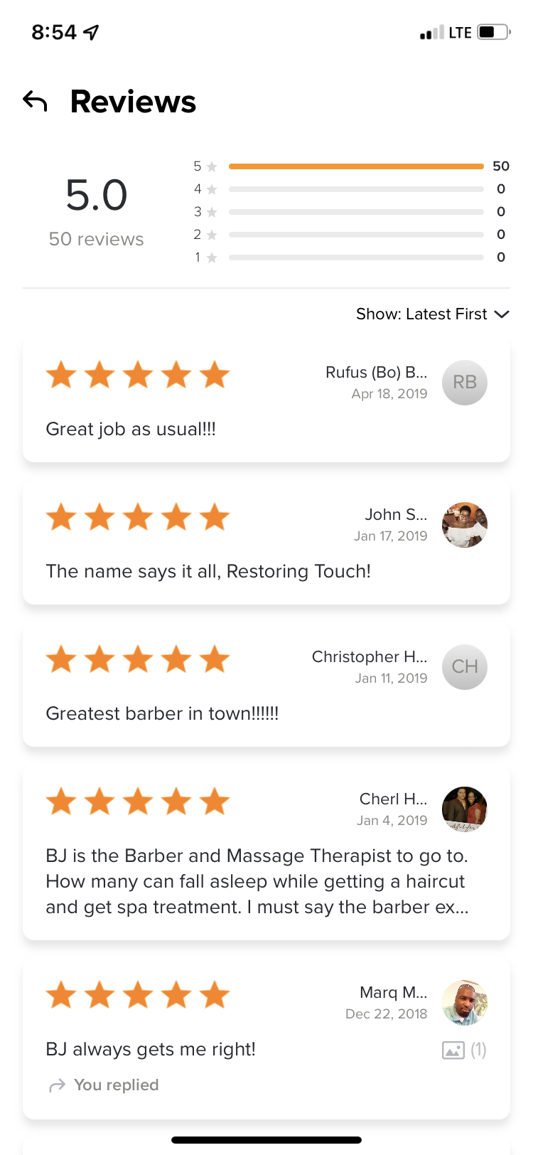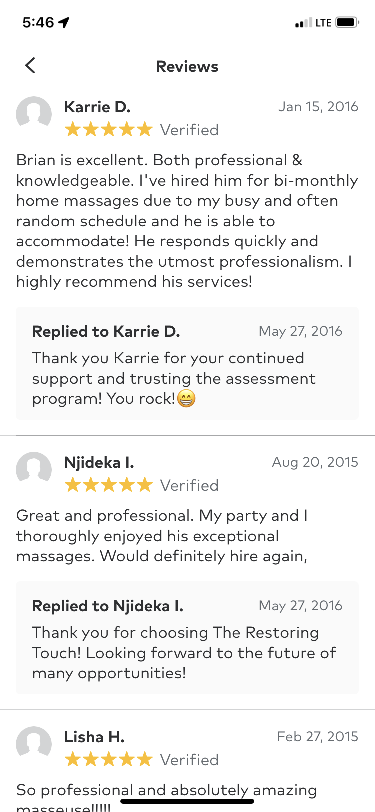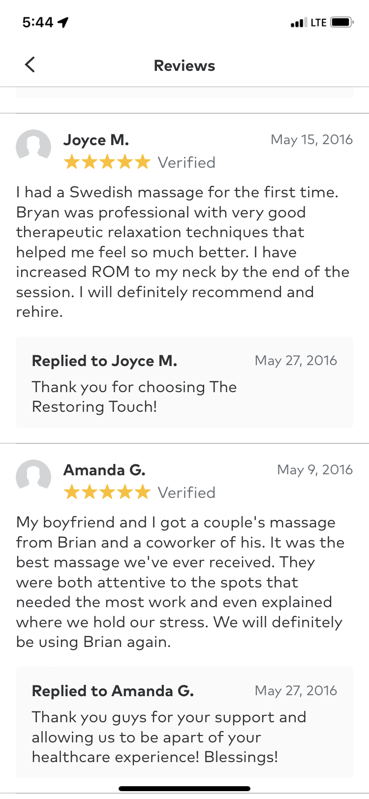 Here's what others have said over the years and currently about "T.R.T." (The Restoring Touch LLC. ) Click on any review to enter the gallery.